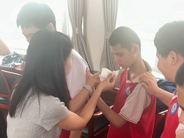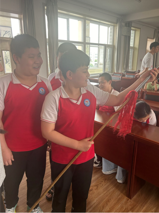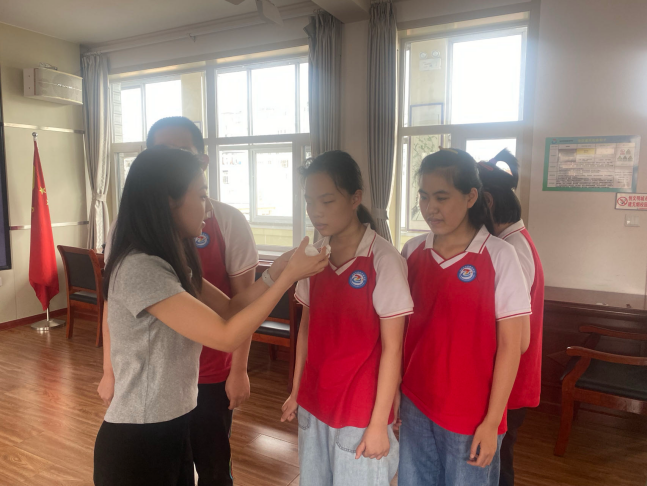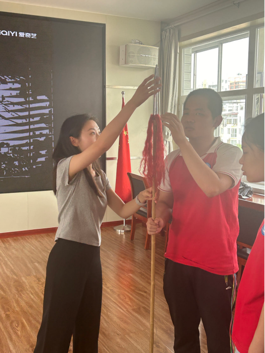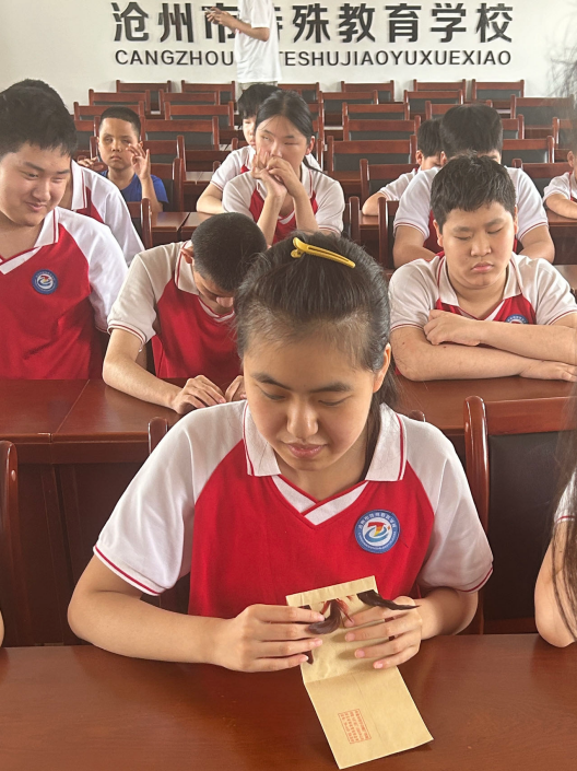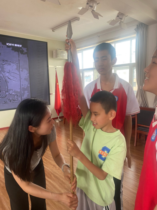 段晨老师运用生动的语言将电影中的场景、人物和情节一一呈现在盲童们的脑海中。盲童们听得津津有味,仿佛身临其境,影片紧张刺激之处孩子们自发小声讨论,有趣生动之处孩子们放声大笑,现场气氛热烈活泼。讲述完毕后,段晨老师向盲童们展示了影片中十分重要的三样道具:粘有鸡毛的信件、红缨枪和小炮。盲童们依次触摸了鸡毛信和红缨枪,并且闻了小炮中的火药,调动他们的嗅觉去感受战争期间硝烟的味道。这些真实的触感和味道让盲童们更加深入地理解了电影中的情节和背景,也让他们对那段历史有了更加深刻的感受。