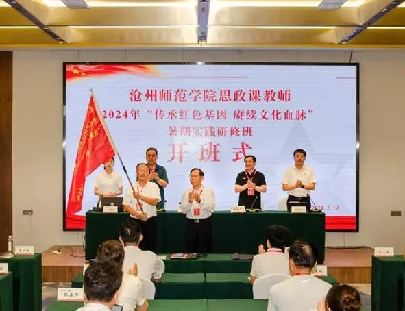 校长张占平在暑期实践研修开班仪式上为马克思主义学院院长李树旗授班旗。
