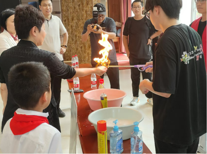 开幕式上,主持人讲述了科技创新的重要性,志愿者进行了实验展示。“神奇的液体世界”“马德堡半球”“克拉尼图形”等实验吸引着孩子们的目光,“真金魔法球”“变脸大师紫甘蓝”“乾坤颠倒,真假虚实”等实验引发着孩子们的思考。志愿者们还展示了“火焰掌”、“粉末爆炸”和“地狱火降临”等生动有趣的科学实验。孩子们不仅能够观察到有趣的物理现象,还能真切的体会到科学技术的神奇,切身感受到前沿科技与现代生活的创新性结合。