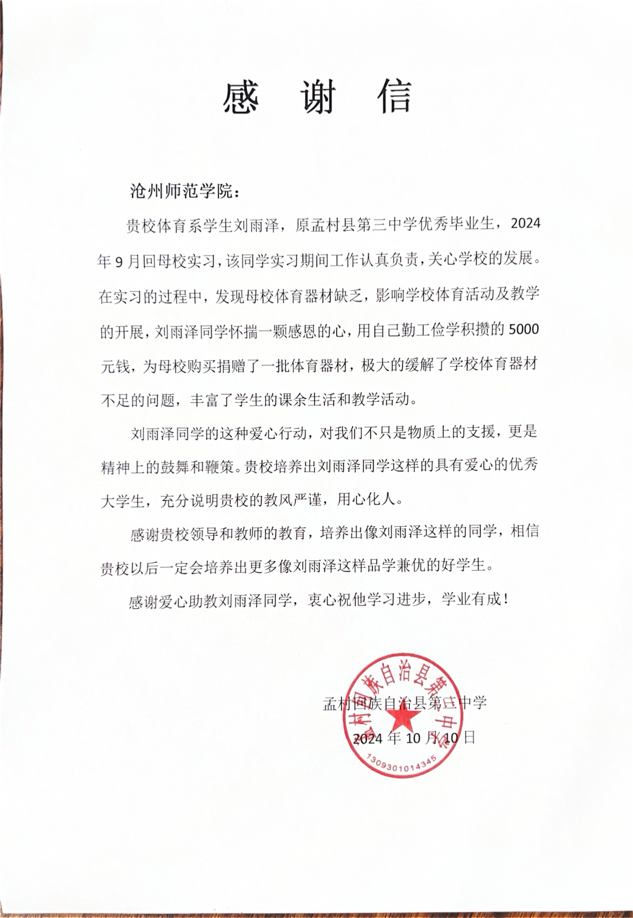 近日,孟村回族自治县第三中学向伟德发来感谢信,对伟德刘雨泽同学的爱心捐赠行为表示感谢和赞扬。