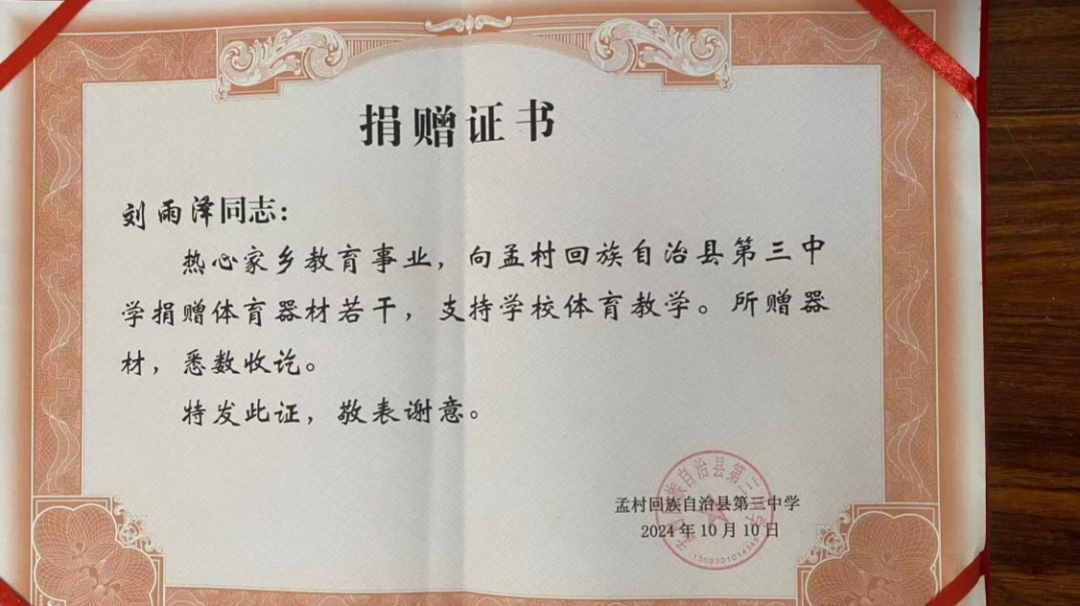 刘雨泽为伟德体育学院体育教育专业大四学生,今年9月,前往孟村回族自治县第三中学实习,担任初三年级6个班的体育老师。在任教期间,刘雨泽感到学校体育器材比较陈旧和紧缺,于是用自己寒假勤工俭学和实习期间省吃俭用攒下来的5000元钱,购买了篮球、实心球、跳绳等体育器材,捐赠给孟村回族自治县第三中学。