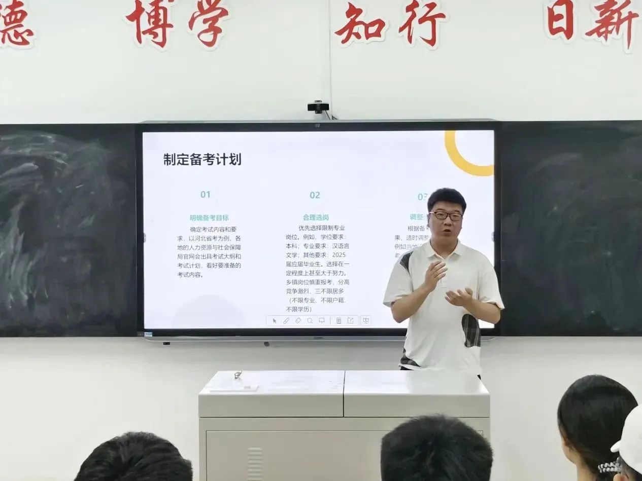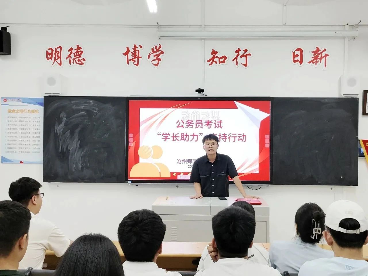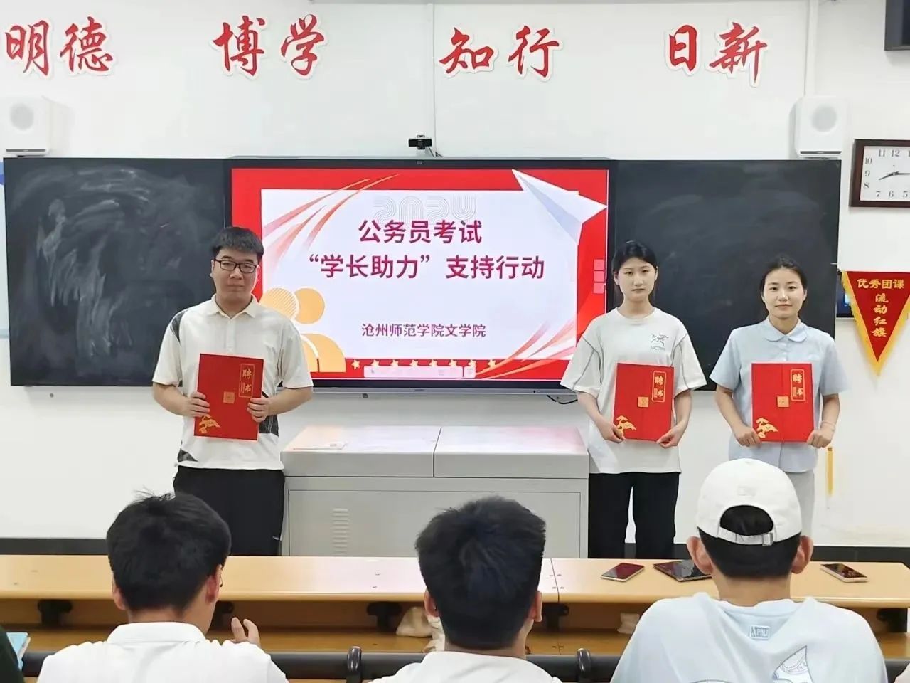 公务员考试助力活动由辅导员江许林主持,邀请2024届毕业生,成功通过国考、省考的国家税务总局围场满族蒙古族自治县税务局暴子跃、丰宁满族自治县林业和草原局孙相宇、辛集市发展和改革局郄璐媛帮助在校生梳理考试信息,分析试题结构,完善备考规划,传授备考经验。三位同学被聘为“文学院公考助力官”, 他们在活动现场与同学们展开积极互动、答疑解惑,未来也将为有志于公职考试的在校生提供持续帮扶。