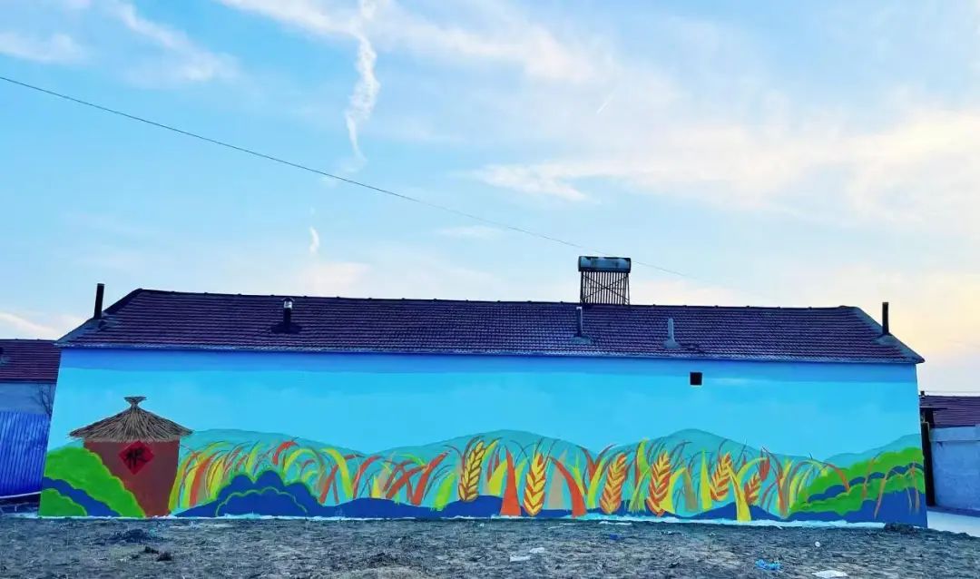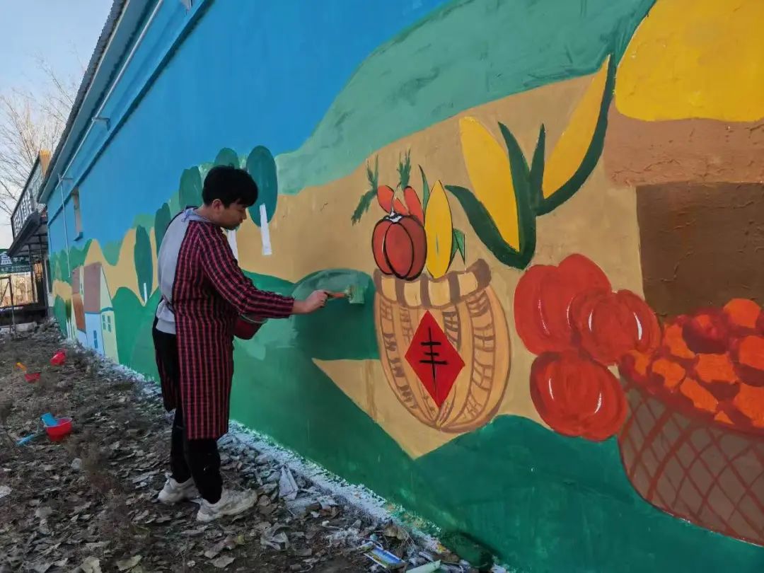 经过8个小时的紧张工作,志愿者们成功完成了5幅4*15米的主题墙绘。墙绘作品以“美丽乡村”为主题,内容涵盖了田园风光、乡村文化、民族团结等多个方面,不仅展现了乡村的自然美景和人文特色,也传递了积极向上、和谐共生的乡村发展理念。