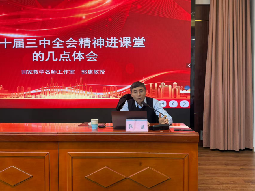 郭建以《二十届三中全会精神进课堂的几点体会》主题,从党的二十届三中全会召开的重大意义、进一步全面深化改革的总体思路与系统部署、进一步全面深化经济体制改革的特点与重点等三个方面进行讲解。