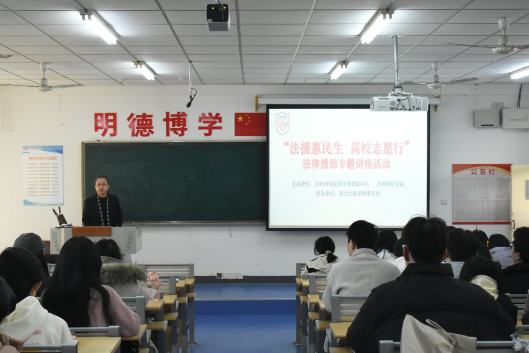 为切实助推沧州市高校法律援助工作迈向新台阶,深化与沧州市法律援助中心的合作,政史学院于12 月 18 日在沧兴教学楼 12 阶梯教室精心组织了一场以“法援惠民生,高校志愿行”为主题的专题讲座。此次活动特邀河北经航律师事务所的宫经亮律师,为法学专业的同学们带来了一场别开生面且极具教育意义的法律知识盛宴,法学专业教师唐逸凡担任活动主持。