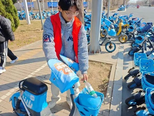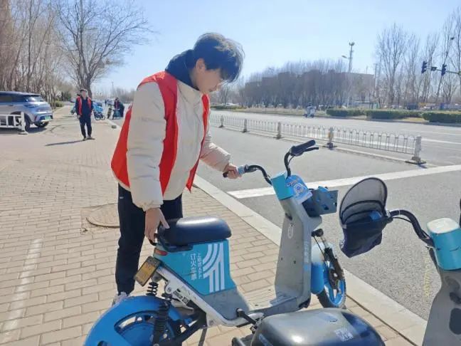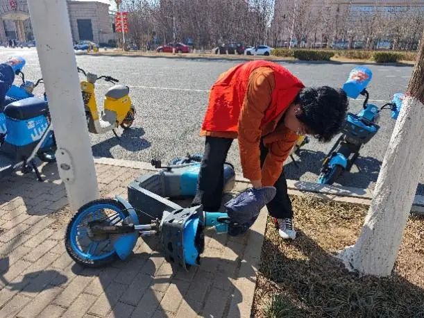 活动中,志愿者将学校东门、天成名著三期附近随意停放的共享单车摆放整齐并清理车辆周边垃圾。