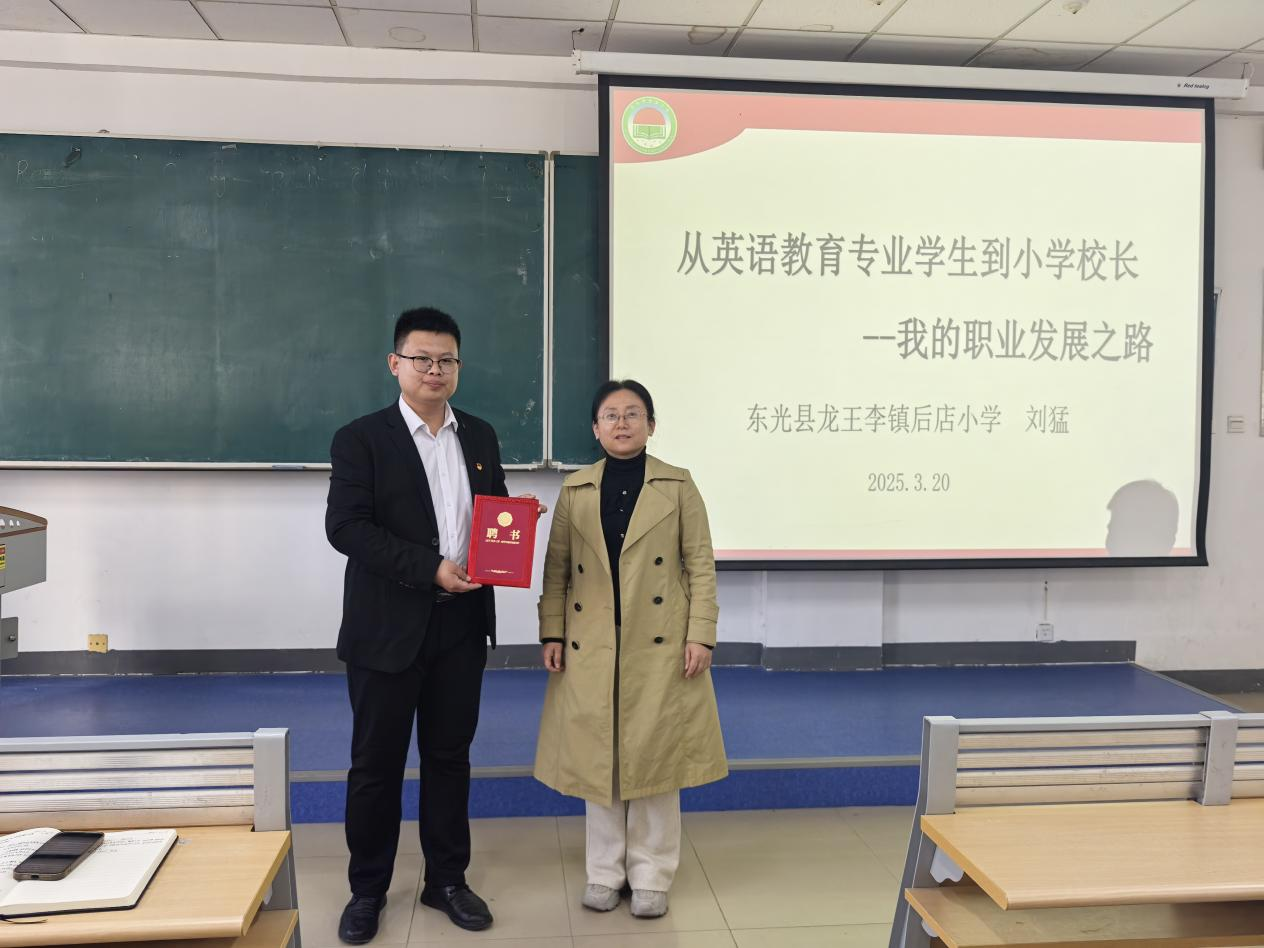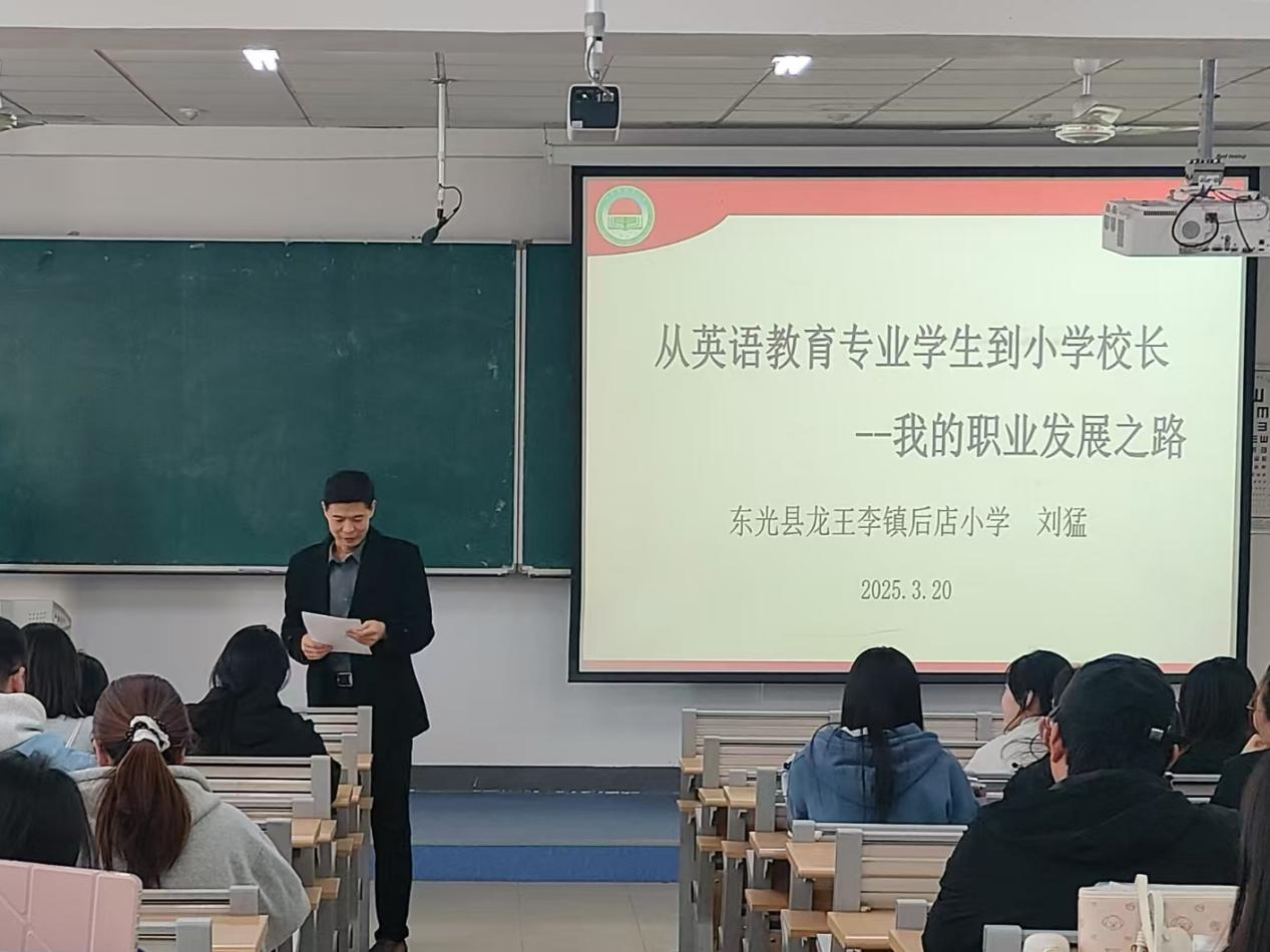 为帮助同学们更好地规划职业道路,明确未来发展方向,3月20日下午,外国语学院邀请到了13届优秀毕业生、现东光县龙王李镇后店小学校长刘猛为同学们带来了一场精彩的职业生涯规划讲座。外国语学院副院长徐广林主持。