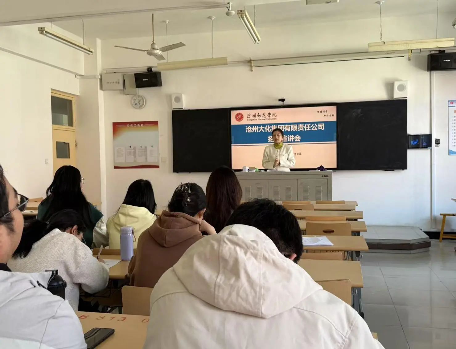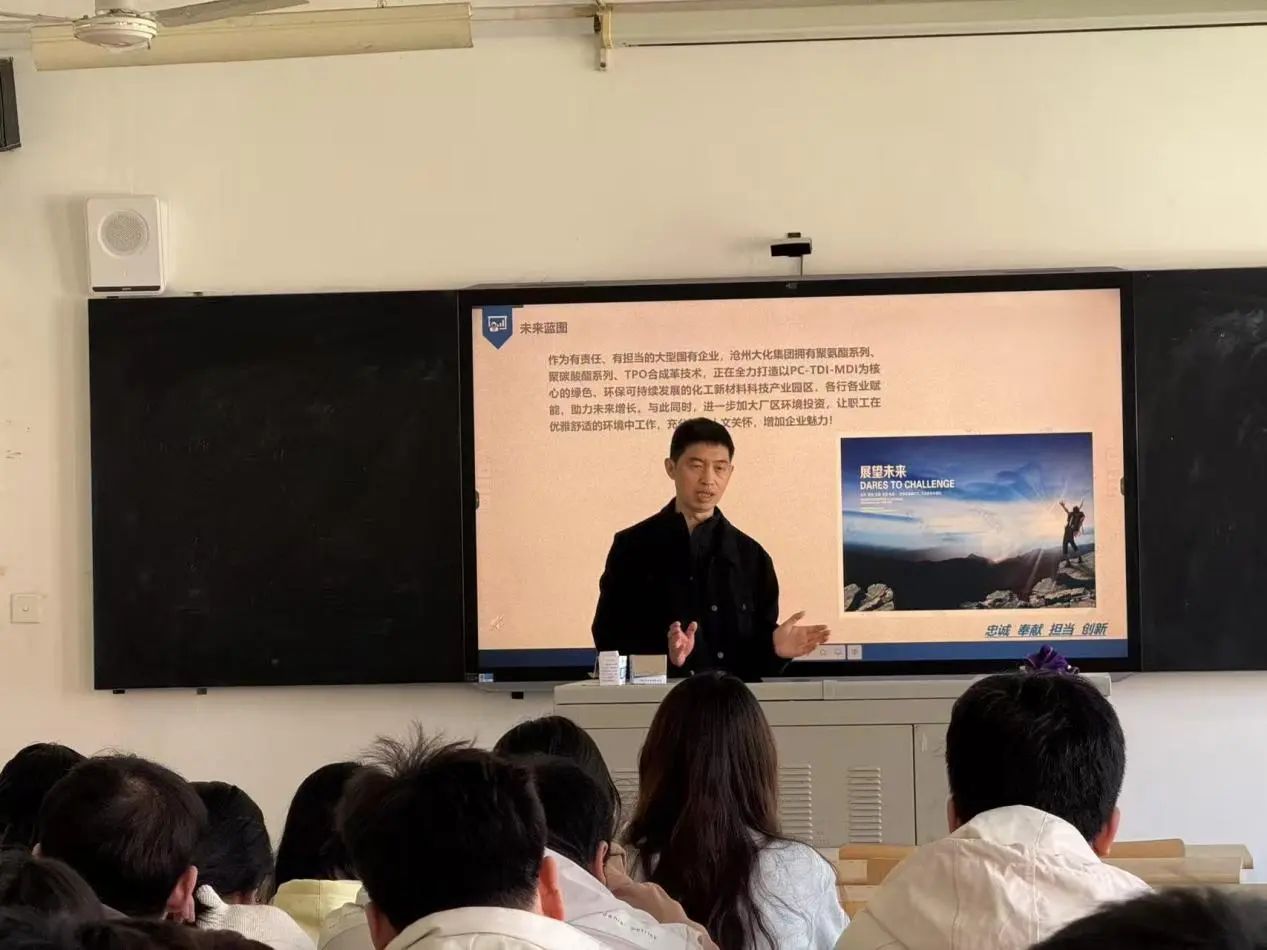 宣讲会上,沧州大化人力资源部经理李春光向在场学生全面介绍了企业的发展历程、产业布局及未来战略。李春光表示,企业高度重视人才梯队建设,本次计划招聘化工操作、设备维护、分析技术员等岗位,需求专业涵盖化学工程与工艺、应用化学、环境工程等多个方向,并为应届生提供完善的培养计划和职业发展通道。