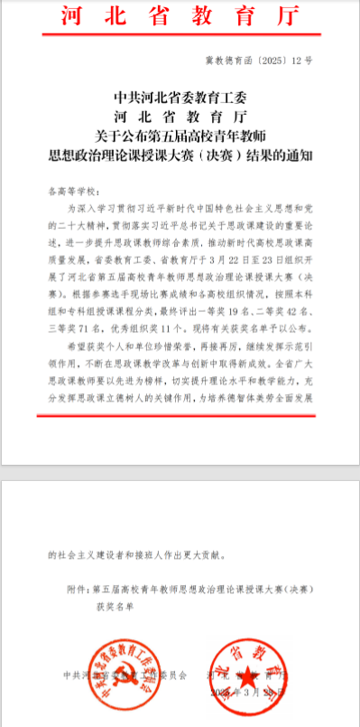 为深入学习贯彻习近平新时代中国特色社会主义思想和党的二十大精神,贯彻落实习近平总书记关于思政课建设的重要论述,进一步提升思政课教师综合素质,推动新时代高校思政课高质量发展,省委教育工委、省教育厅于2025年3月22日至23日组织开展了河北省第五届高校青年教师思想政治理论课授课大赛(决赛)。伟德马克思主义学院思政课教师邹浩、董涵哲凭借扎实的理论功底、精彩的教学设计和灵活的课堂呈现分别获得二等奖、三等奖。