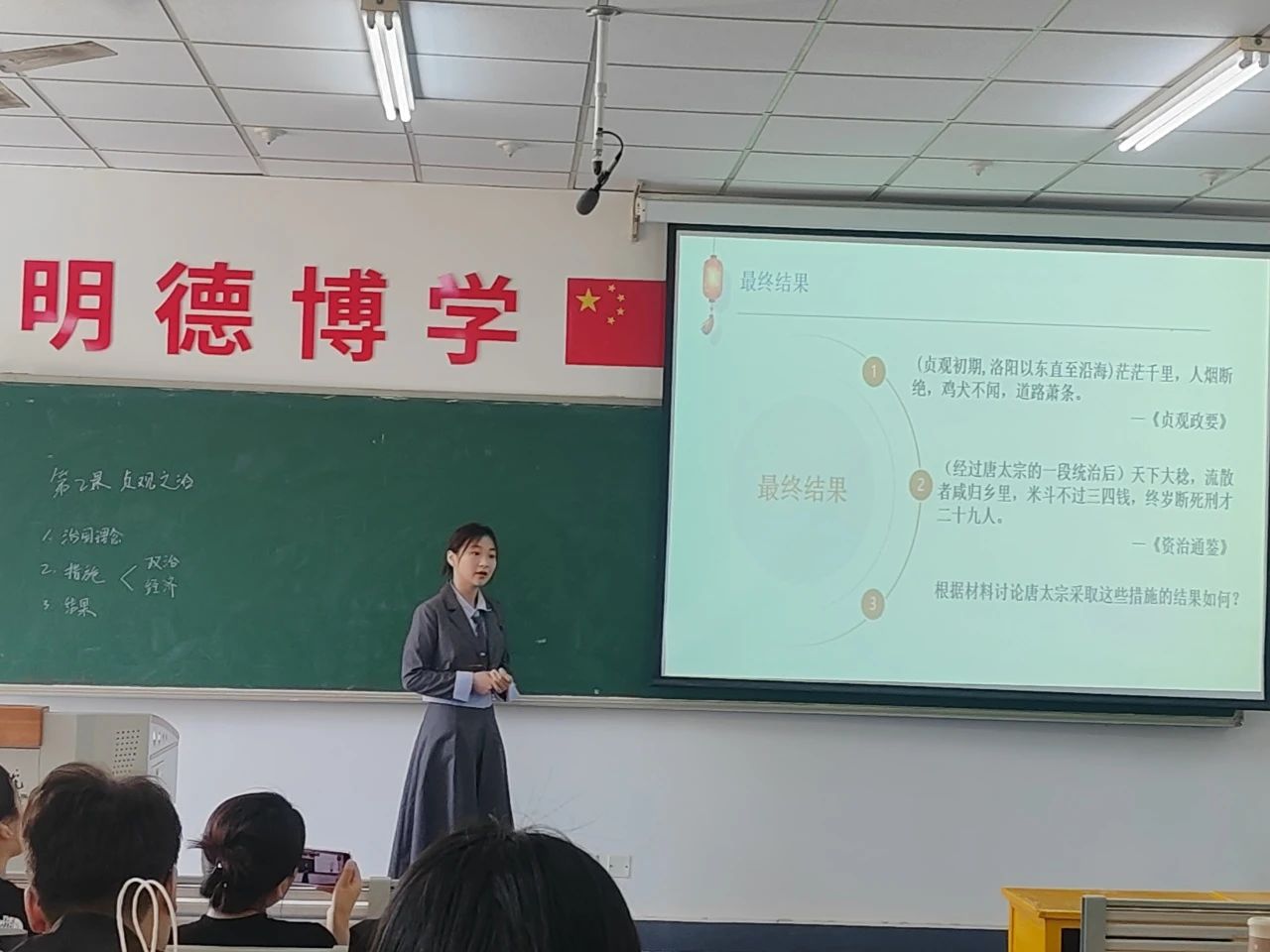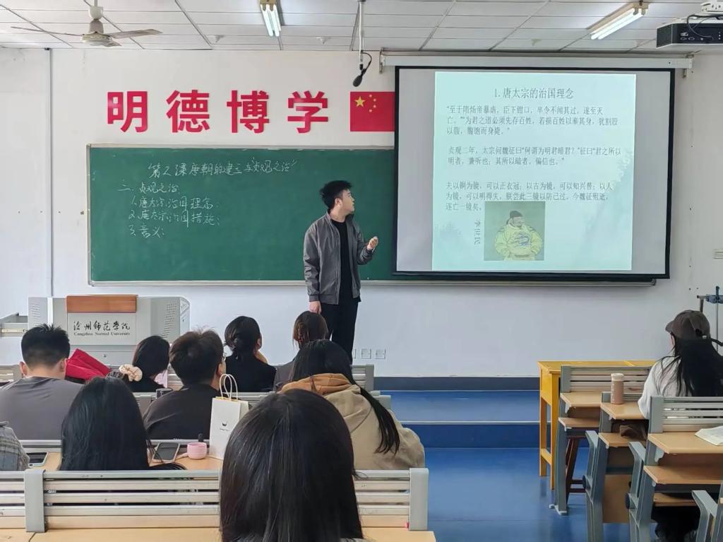 马佳悦、柳旭诚、孟祎蕊、公婷婷四位学生代表围绕七年级上册《贞观之治》进行同课异构试讲。试讲通过多样化的教学设计,将理论知识与实际教学场景相结合,展现了师范生的专业素养与创新思维。