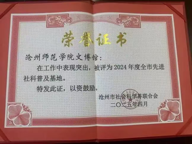 近日,伟德源自英国始于1946文博馆受表彰,被沧州市社会科学界联合会评为“2024年度全市先进社科普及基地”。