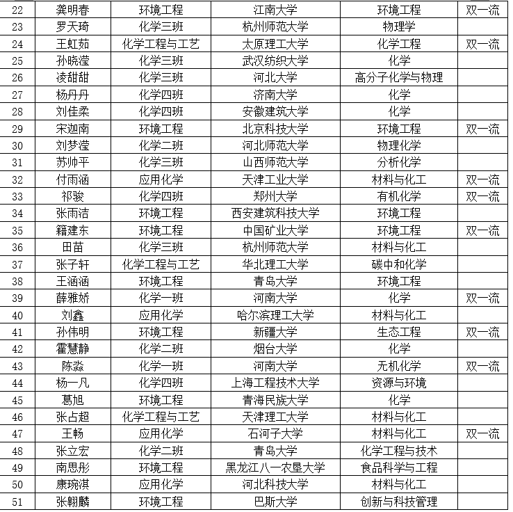 少年当立鲲鹏志,勇毅前行闯新天。在2025年全国硕士研究生招生考试中,化学与化工学院学子再传捷报,续写辉煌!截至目前,化学与化工学院2025届毕业生共有51名同学金榜题名,其中12人考入211院校,17人被“双一流”建设高校录取,5人被“双一流”建设学科录取。这一份份沉甸甸的录取通知书,见证了同学们日夜兼程的拼搏,也彰显了化学与化工学院人才培养的突出成果!