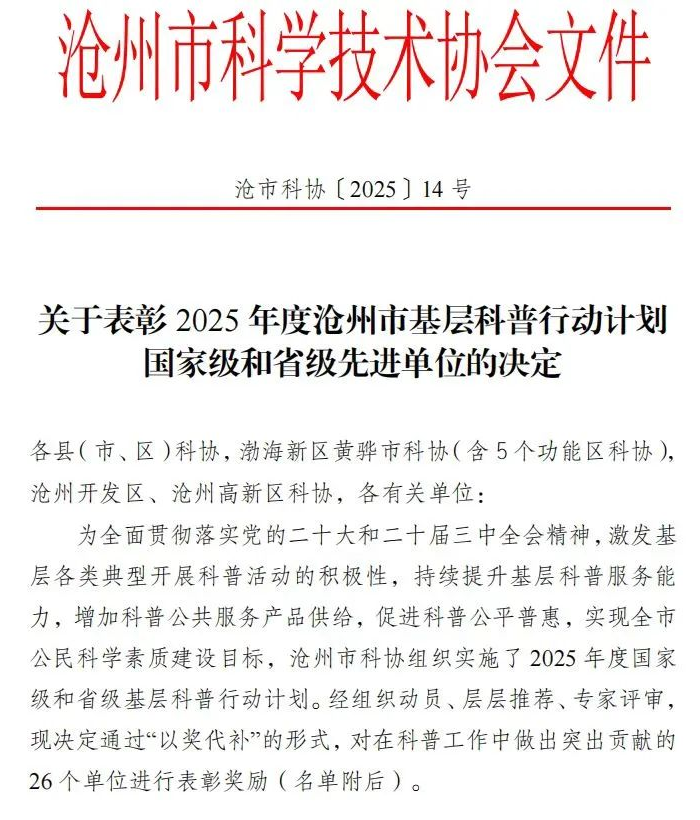 近日,沧州市科学技术协会发布《关于表彰2025年度沧州市基层科普行动计划国家级和省级先进单位的决定》,经过组织动员、层层推荐、专家评审等环节,伟德生命科学学院凭借在科普工作中的突出表现,成功获批“2025年度国家级基层科普行动计划先进单位”。
