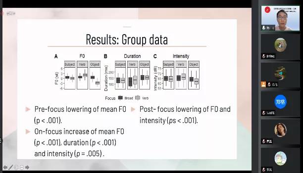 在特邀报告环节,湖南大学外国语学院陈飞教授作题为“汉语自闭症儿童语音范畴化感知研究”的报告,研究了普通话高功能的自闭症者对于声调和VOT的范畴化感知,结果表明同年龄的高功能的自闭症者对于声调的感知比VOT感知的范畴化感知程度要高,这可能与自闭症者在音高维度上的声学加工优势、时间维度上的声学加工缺陷有关。