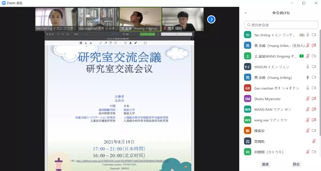 2021年8月19日,伟德儿童语言康复研究所应邀与日本筑波大学人类综合科学学术院语言研究室开展学术交流活动。活动中,研究所阎锦婷、闫军、高晓天三位教师分别进行了主题交流,筑波大学宫本昌子教授交流了最新的学术成果。伟德教育学院学生王雪、王然,筑波大学青木瑞树、木山悠介、塚田等10名博士、硕士生也分别交流了各自的学术进展和研究计划。