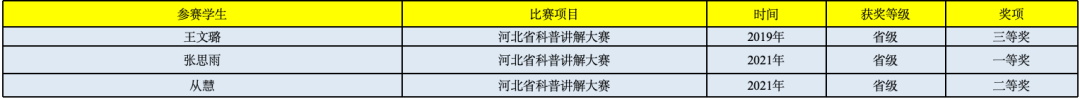近年来,学生专业知识和技能愈发扎实,在课堂学习和科研实践中展现出较强的学习能力和创新能力。在全国大学生生命科学竞赛、“河北省实验展演汇演”、大学生创新创业大赛、“挑战杯”全国大学生课外学术科技作品竞赛等各类学科竞赛中成绩优异,累计62人先后在国家、省市级比赛中获奖。